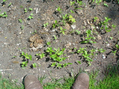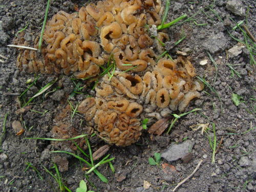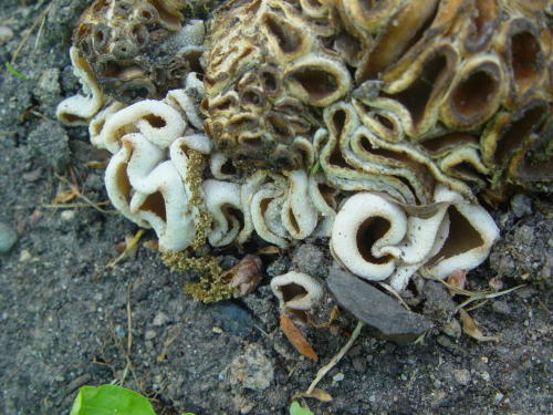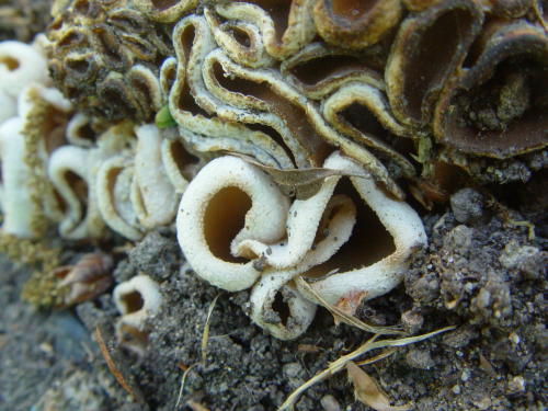 | Bis zur Mitte bestand Gefahr von Nachtfrösten, dann mischten sich ein paar recht warme Tage ein. Allerdings mit viel zu wenig Regen. Aber dennoch gab es eine Überraschung, und diese auf sandiger Erde, welche einen Meter Bauschutt nur spärlich bedeckte: Verdacht auf Peziza proteana var. sparassoides, den Kohlkopfpilz. Erwies sich letztlich als Pezizaa vesiculosa, Blasen-Becherling, allerdings auf unüblichem Substrat. Um dieses Phänomen dennoch zu würdigen, hier ein paar größere Bilder: |