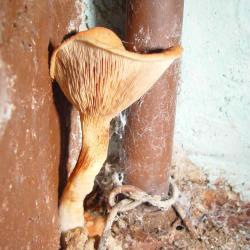 | Zunächst war es mal wieder zu trocken. Völlig unempfindlich zeigten sich nur der Kahle Krempling, besonders wenn er sich ein kühles Plätzchen im Keller aussuchte. Das Mycel wuchs an der Wasserleitung entlang. Anderthalb Meter höher, aber im Freiland erschienen später ebenfalls jede Menge Kremplinge. | |