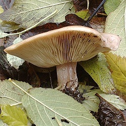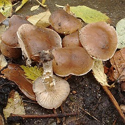 | Alles dabei: Feuchte Plusgrade, knackige Fröste, Schnee und Orkan. Auch noch ein paar Pilze. Der dicke Weichritterling (siehe 2004) entpuppte sich inzwischen als Melanoleuca robertiana und zeigte sich in geringer Zahl. An manchen Stellen noch Schmutzige Rötelritterlinge (Bild), aber sooo schmutzig sind die gar nicht. | |