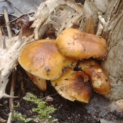 | Alles dabei: Frost und Schnee (anderswo heftig), zweistellige Temperaturen, Orkan und blühende Krokusse. An Pilzen im Prinzip nix, außer unerschütterlichen Häublingen und Helmlingen, sowie einem neuen Gartenbewohner: Samtfußrübling. Suchte sich einen extrem stacheligen Ort aus, nämlich eine Rhus-Art. Schützt wohl vor Zugriff? |