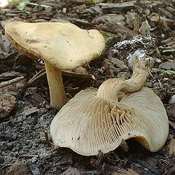 | Und hier noch das Ende einer Legende: Mein "Wintertrichterling", so der inoffizielle Name innerhalb der EU, erschien in einem Sommermonat, allerdings als Einzelexemplar. Mutmaßlich handelt es sich doch um Clitocybe squamulosa und meine Hoffnung auf wenigstens eine var. hiemalis ist endgültig versiegt. |