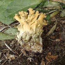 | Noch ein erfreulicher Fund im eigenen Garten! Die ist eine Ramaria nahe bei abietina, weil grünend. Hat aber einen anderen Habitus, andere Ökolgie und größere Sporen. Als Varietät noch zu beschreiben von J. CHRISTAN (Erding). Für dessen Begutachtung sei herzlich gedankt. |