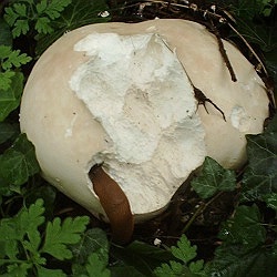 | Einige eher banale Bemerkungen: Der Riesen-Bovist gedeiht wieder mal nicht selten, stellt aber eine offenbar bevorzugte Delikatesse für Schnecken dar. Mahlzeit! Auch einige persönliche, private Exemplare wurden schon im Jugendstadium zerfressen. Oder mein Herr Sohn hinterließ tiefe Fahrradspuren mitten drin. | |