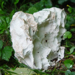 | Und wenn in einer schattigen Ecke sich ein Riesen-Bovist aufmacht, fallen gleich über Nacht die Schnecken drüber her. Erstaunlich ist übrigens, wie lange der Bovist sogar als benagte Ruine wachsen kann. |