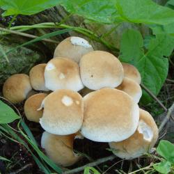 | Andere Holzliebhaber waren der Gesähte Tintling und der Südliche Ackerling (Bild), eine treue Seele seit vielen Jahren an seinem Pappelstumpf. Nebenbei: Zur Monatsmitte zerpflückte ein Gewittersturm die Landschaft. Den Pilzen hat das aber nix genützt. |