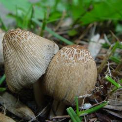 | Und weiter geht es mit überwiegender Dürre und kräftig oszillierenden Temperaturen. Ab und gab es ein wenig Regen, der aber nur für Pilze mit Holzkontakt reichte. Das Bild zeigt scheinbar einen Rißpilz, es ist aber wieder mal der Zucker-Tintling, gleich nach dem Aufschirmen vertrocknet. | |