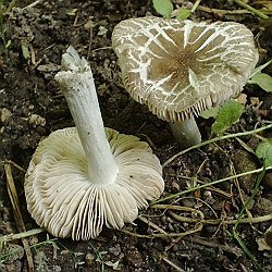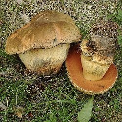 | Dicke Burschen am grasigen Wegesrand unter Birken: Netzstielige Hexenröhrlinge, teilweise mit 20 cm Hutdurchmesser. Begleiter waren in derselben Lokalität Grünblättriger Schwefelkopf, Gilbender Erdritterling und ein kleiner brauner Ackerling (Agrocybe), dessen Name ich nicht jedem verrate, der mal auf meine Seiten zappt. | |