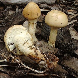 | Hier noch ein interessanter Fund aus der Delitzscher City bzw. einem Beet mit Holzschredder: Stropharia percevalii. Und dabei wird ständig von Abwanderung gesprochen; auch das Gegenteil kann der Fall sein! Die städtischen Mulchinseln waren auch gut bevölkert von Agrocybe praecox und diversen Tintlingen. |