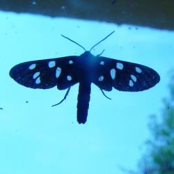 | Vielleicht ist ein Weißfleck-Widderchen am Fenster ein Omen der Klimaerwärmung? Amata phega wurde noch nie im Umkreis gesichtet; die Art soll Trockenland bevorzugen. |