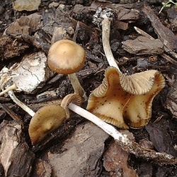 | In Nachbars dick gemulchten Beeten gab es auch Neues zu entdecken: Psilocybe cyanescens, der Blauende Kahlkopf (Bild) zwischen Psathyrella microrhiza und Mycena stipata. Alles bunt durcheinander. Außerdem die letzten Glimmer-Tintlinge des Jahres. | |