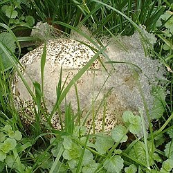 | Und schließlich will ich ich nicht verheimlichen, was aus meinem privaten Riesen-Bovist geworden ist. Er ist nicht gewachsen, sondern hat sich erstens mit Pusteln bedeckt und ist zweitens drauf und dran, sich in ein Kaninchen zu verwandeln. Sonst: Nix. |