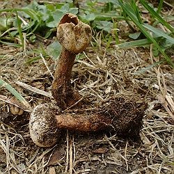 | Erfreuliches hinter der Landesgrenze, im Anhaltinischen. Auf dem Kapellenberg trotzten diverse Erdsterne unter schützendem Fliedergebüsch den Widrigkeiten. Und, als Novum, der Gewimperte Stielbovist Tulostoma fimbriatum trat erstmals im Trockenrasen zahlreich in Erscheinung. |